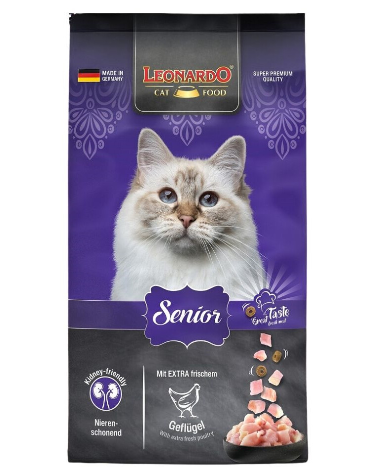 Katėms senstant keičiasi jų mitybos poreikiai. Jų energijos poreikiai mažėja, o imuninė sistema silpsta su amžiumi. Ieškote geriausio pašaro savo vyresniajai katei? LEONARDO Senior yra tobulas pasirinkimas. Šis pašaras be grūdų sukurtas specialiai katėms, kurioms reikia švelnesnės, bet visavertės mitybos. Subalansuota sudėtis atitinka vyresnio amžiaus kačių poreikius, mažina inkstų apkrovą, palaiko idealų svorį ir yra nepakartojamo skonio. Leonardo Senior yra pritaikytas šiems pokyčiams su specialia formule, kad jūsų katė būtų energinga ir sveika brandžioje senatvėje.